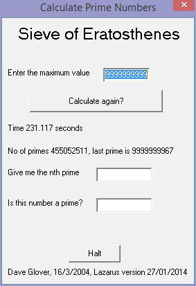 Fancy trying it? Windows users download Primes below, unzip it and execute it. It shows the time taken, number of primes in the range, and the highest prime, and gives you two options for asking about primes. Put a number in either field, and tab out, and it will give you the results.